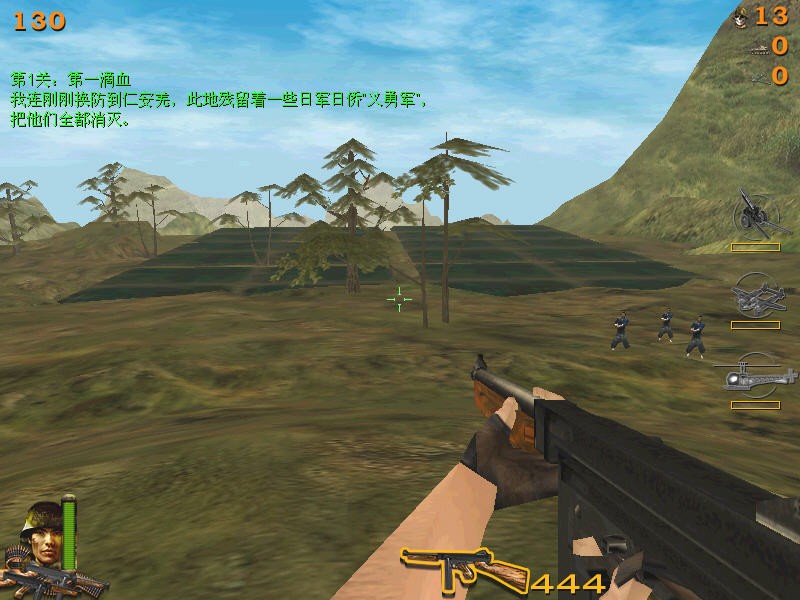1944年抗日战争进入到了最关键的阶段,在抗日大反攻中,你作为中国远征军的成员之一,在一望无际的热带丛林中搜索前进。由于情报有误,你不慎深入日寇的重围。但是你并不孤单,你拥有大量精良的武器:M1911式自动手枪、Thompson冲锋枪、迫击炮、巴祖卡、航空凝固汽油弹。已经武装到牙齿的你,将遭遇日寇越来越疯狂的进攻,尽情地发扬你的火力,消灭敌人。等你的胜利消息,士兵!